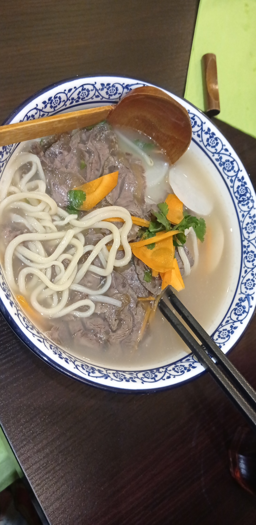 Petite queue a l exterieur pour l attente, malheureusement la serveur fait passer un couple avant moi qui suis tout seul! Lors de la commande, la serveuse me prévient que la texture du boeuf est gélatineux ce qui est appréciable pour ceux qui ne connaissent pas, les nouilles sont fraiche et légèrement epaisses...je les aime comme ca😉! La soupe est bonne et les raviolis sont très bon aussi...