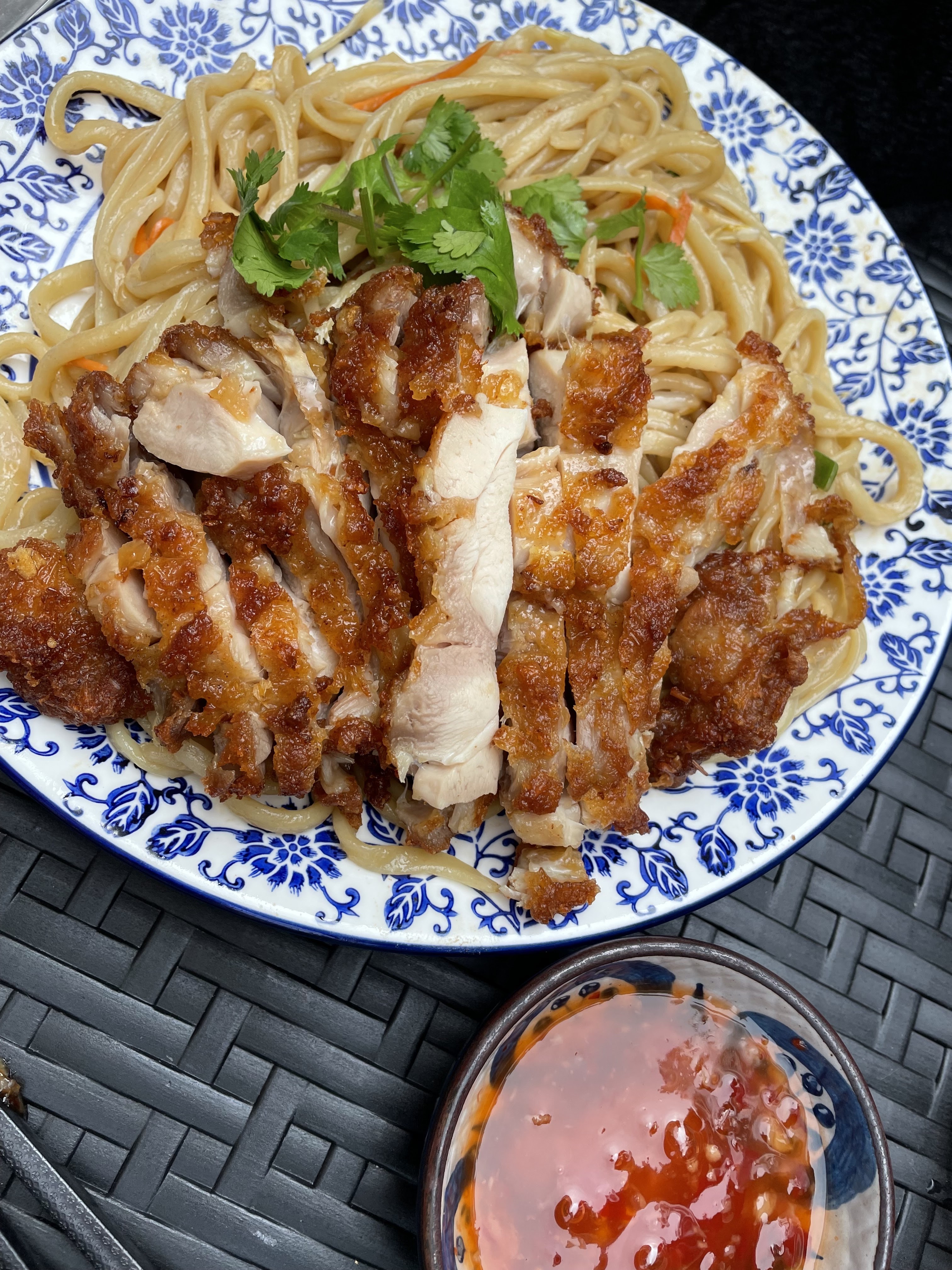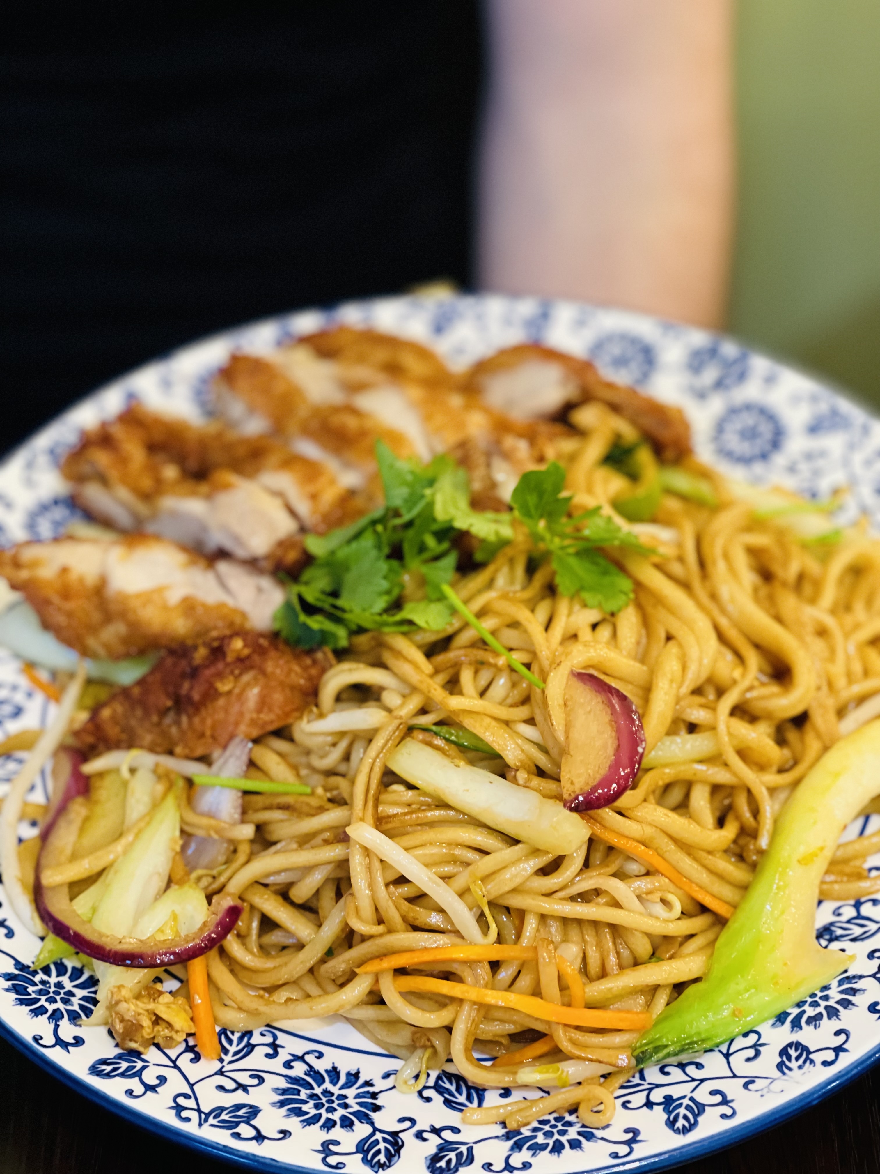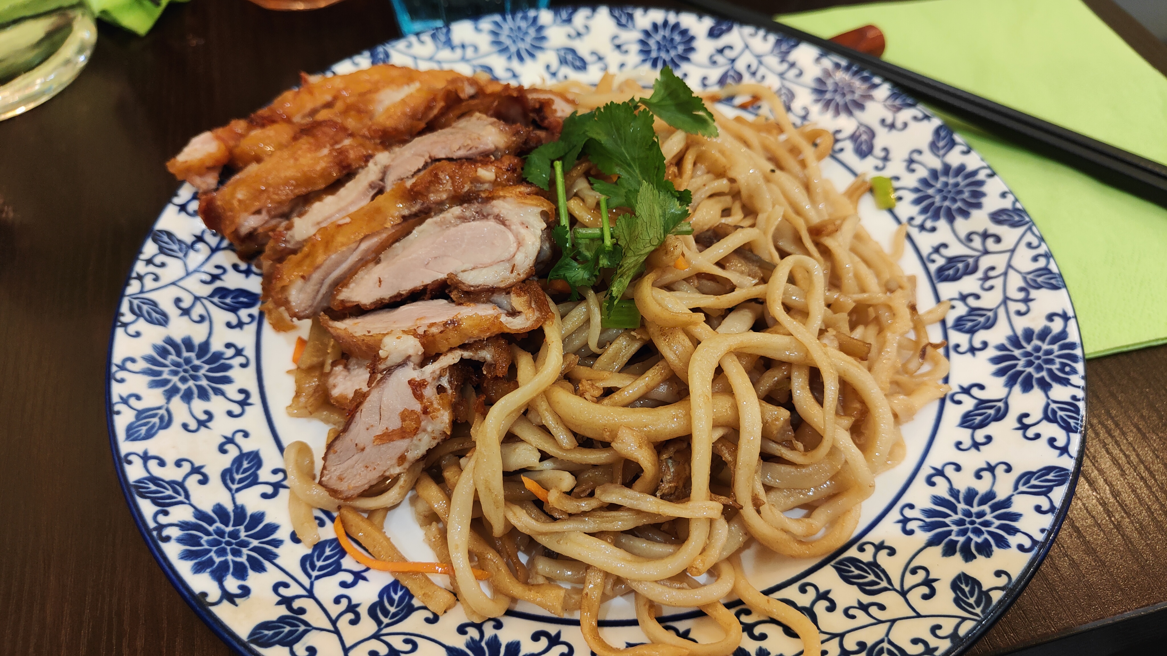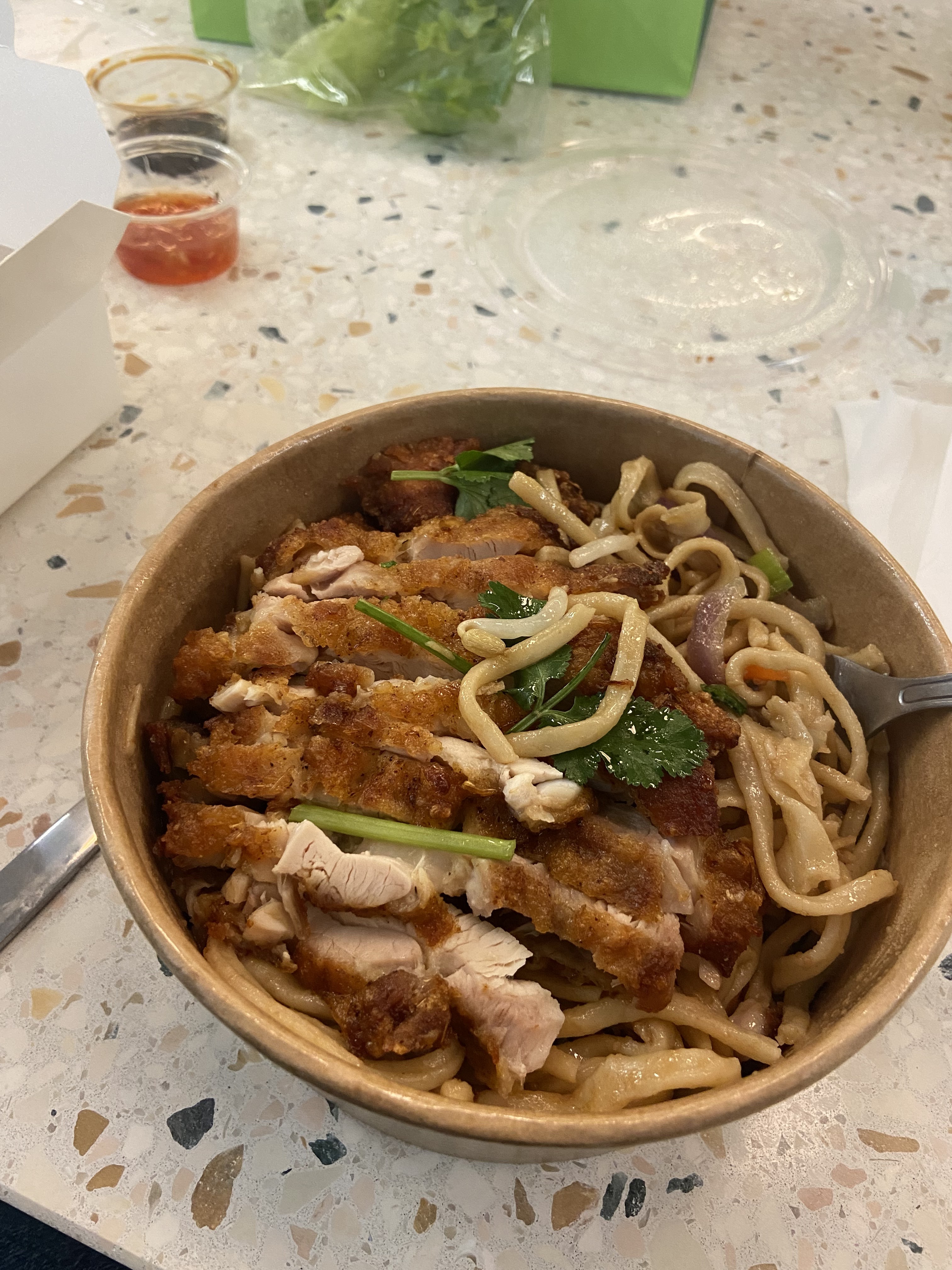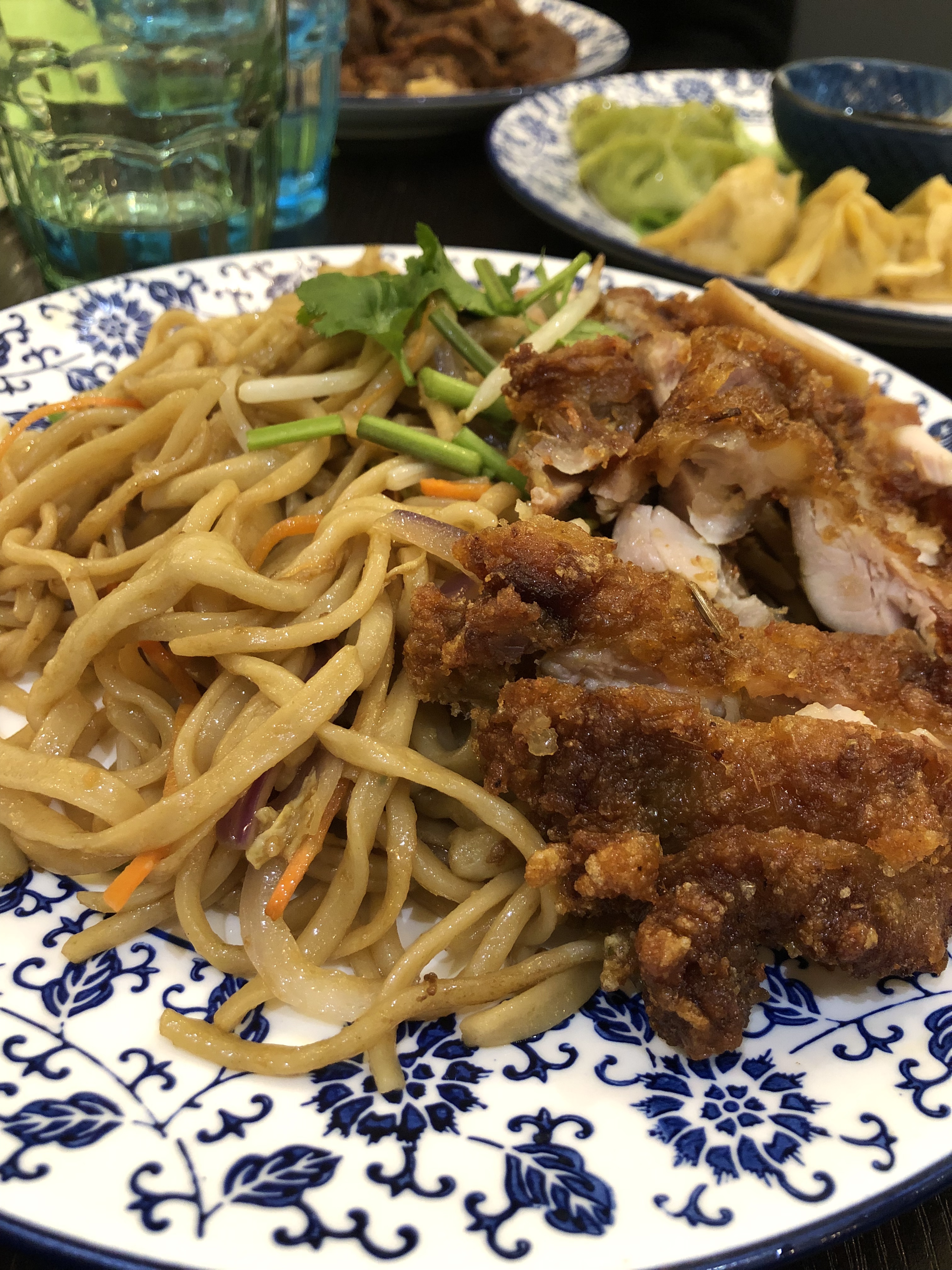 Les nouilles au poulet croustillant étaient excellentes. On voit que c’est du fait maison. Je recommande.