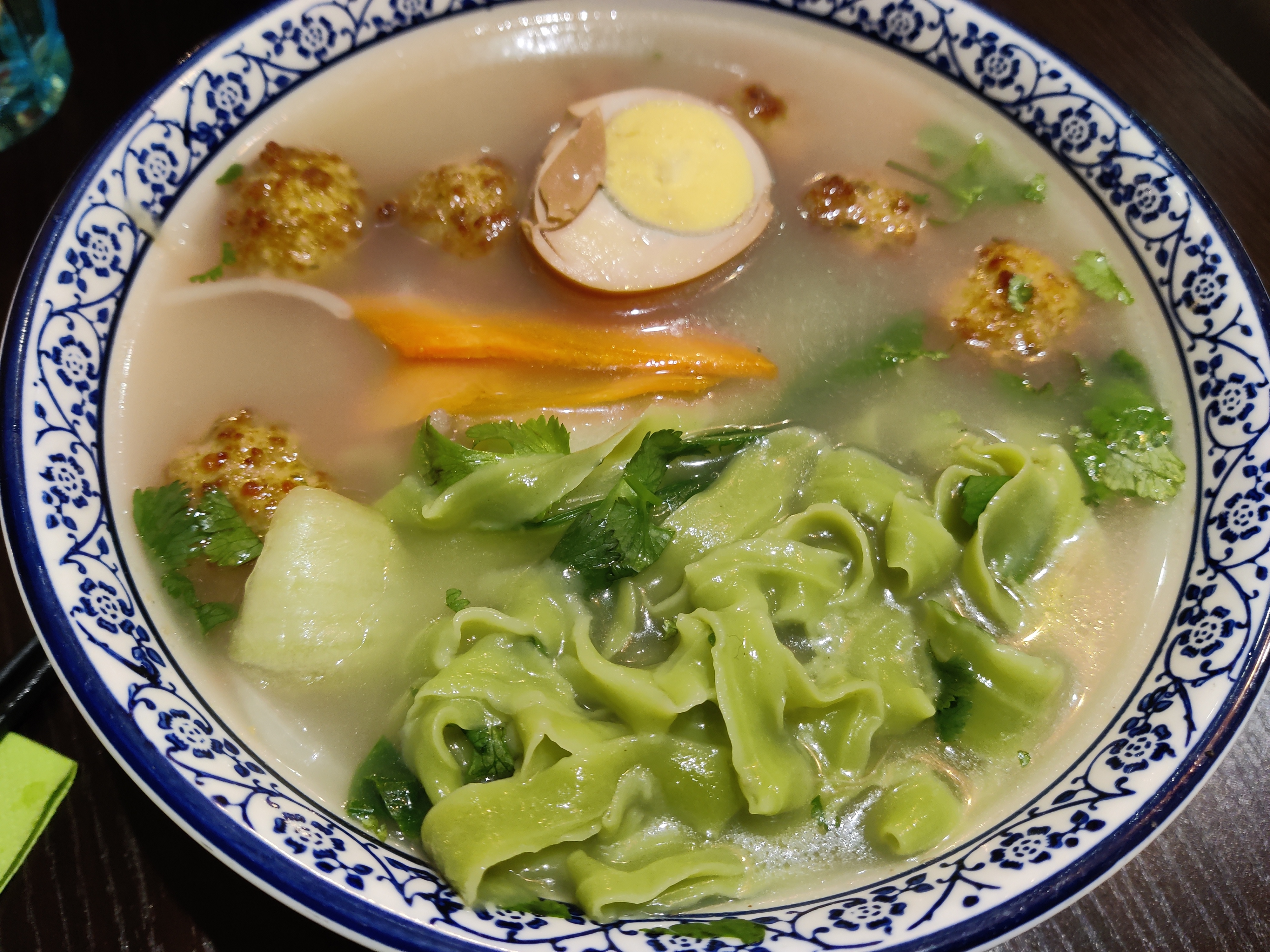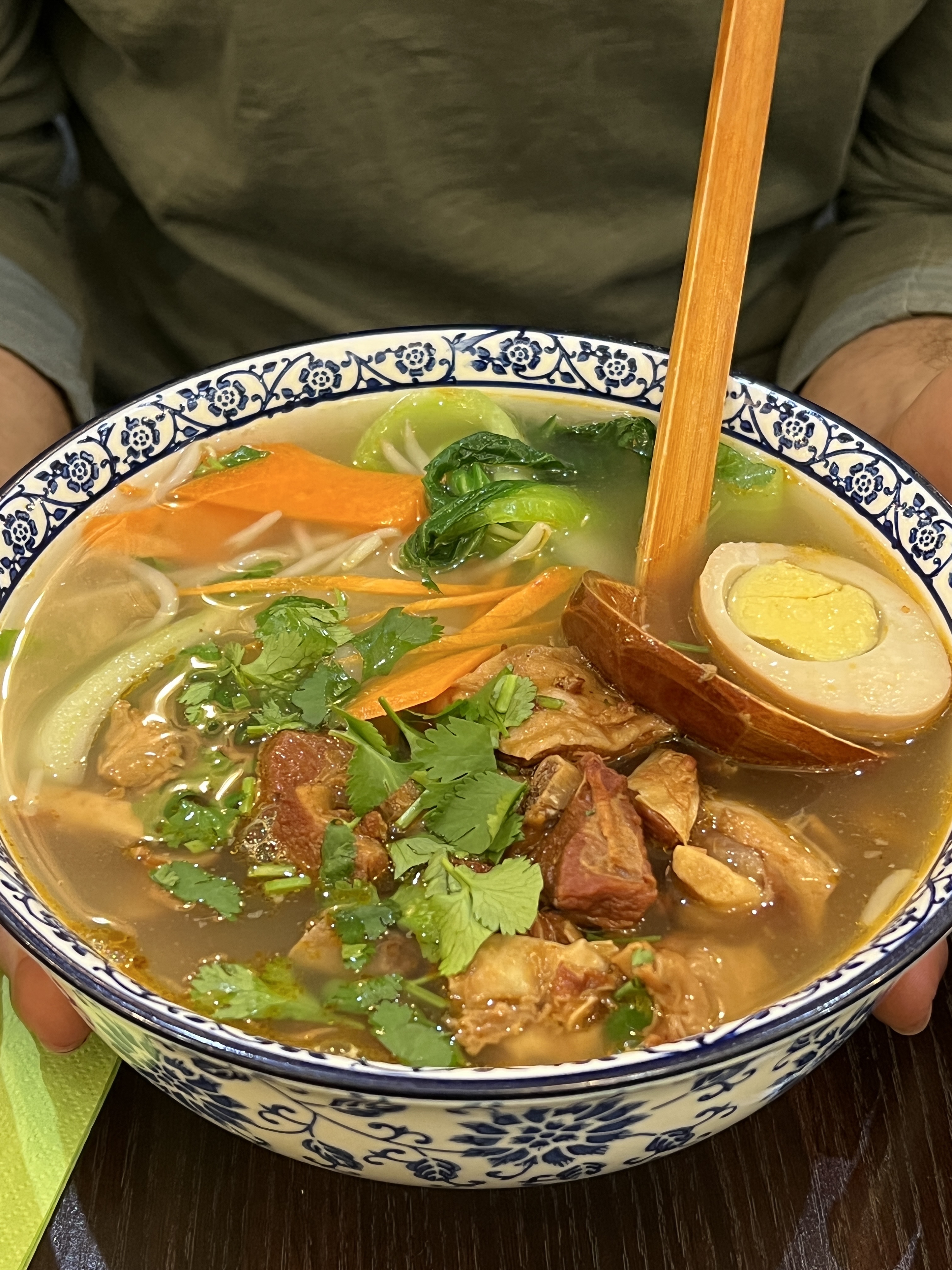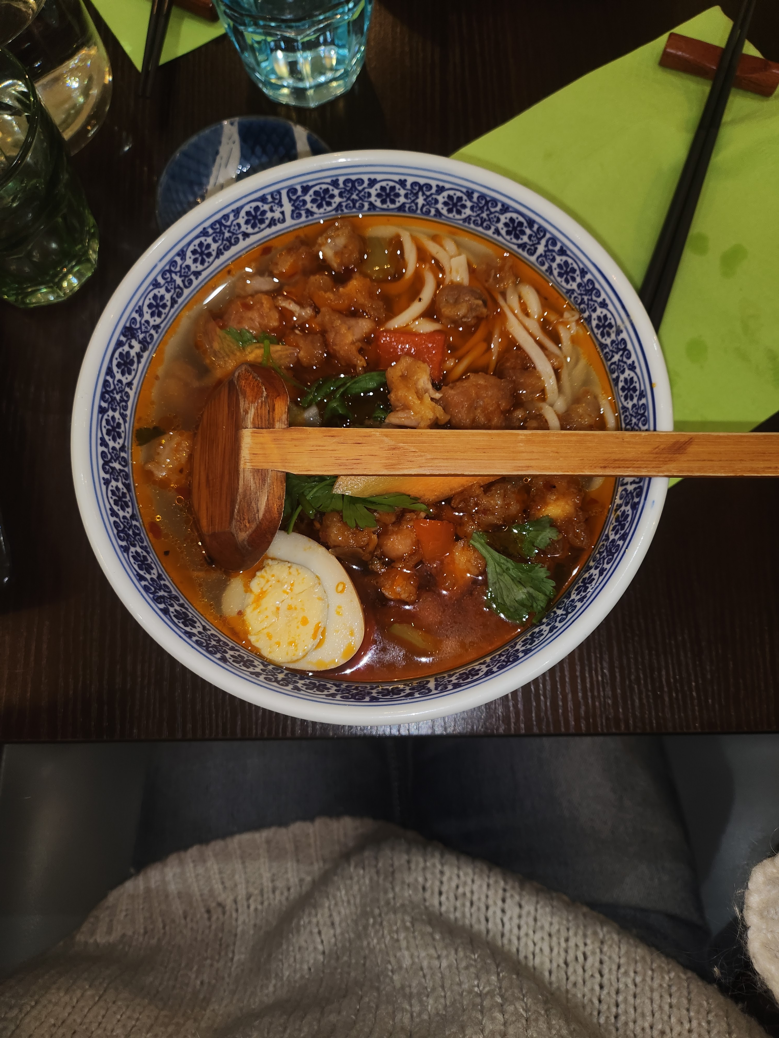 Une très belle decouverte ! Les nouilles sont faites à la main sous nos yeux (j'ai opté pour les nouilles larges vertes, coupées au couteau), les raviolis également. Le bouillon était très bon, les raviolis délicieux, la vaisselle raffinée. Et pour courroner le tout, un service au top ! Je recommande fortement !