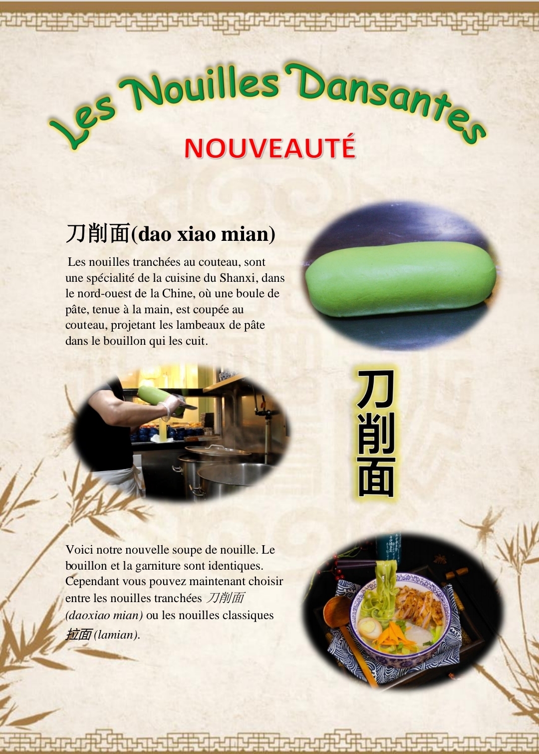 Les nouilles dansantes est un bon restaurant, un petit peu gras mais c'est très bon quand même. Souvent plein, il faut y aller tôt (12h-12h10) pour être sûr d'avoir une place. Les nouilles sont faites sur places et la cuisine est plutôt bonne et cale bien.