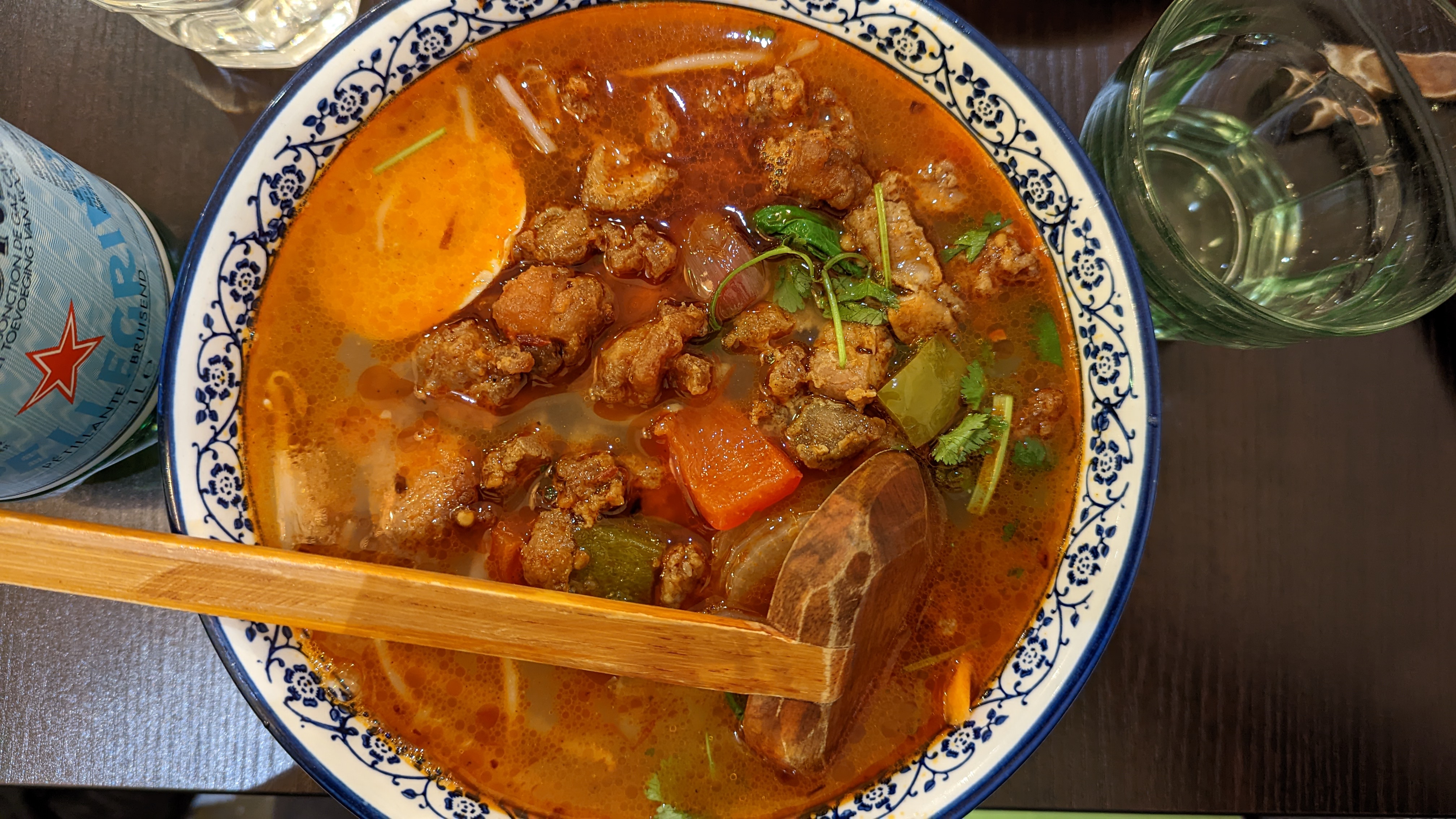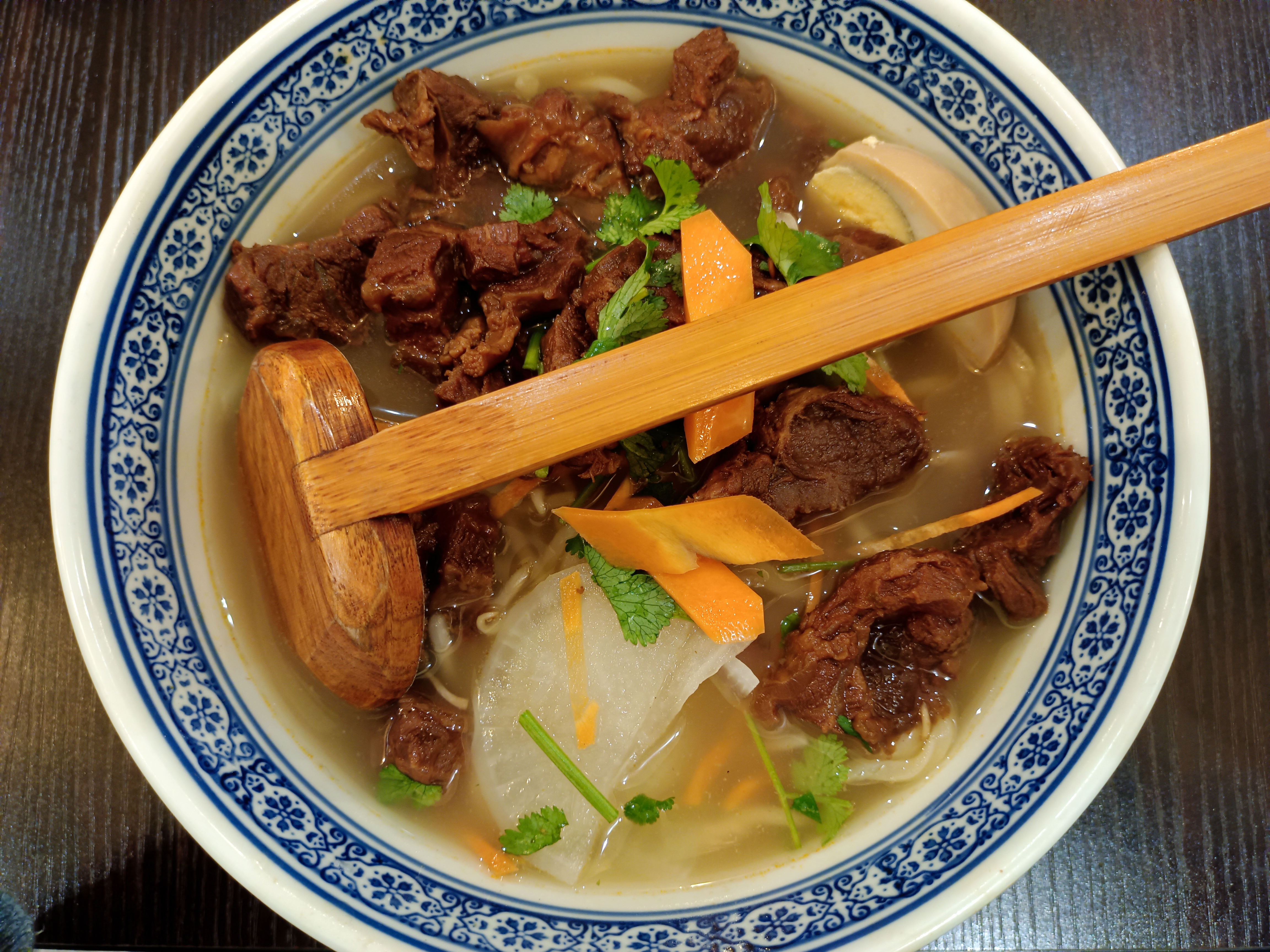 Parfait, Ce n'est pas un grand gastronomique de la capitale, mais que demandez de mieux que des plats simples et très bien préparés à petit prix ? 14,90 € pour un plat de nouilles asiatiques fraîches cuites dans un bouillon succulent, et accompagnés de multiples légumes (radis blanc, chou chinois, carotte, pousses de soja, coriandre...), d'un œuf dur savoureux et de viandes au choix Et c'est copieux - Aucune raison d'être déçu