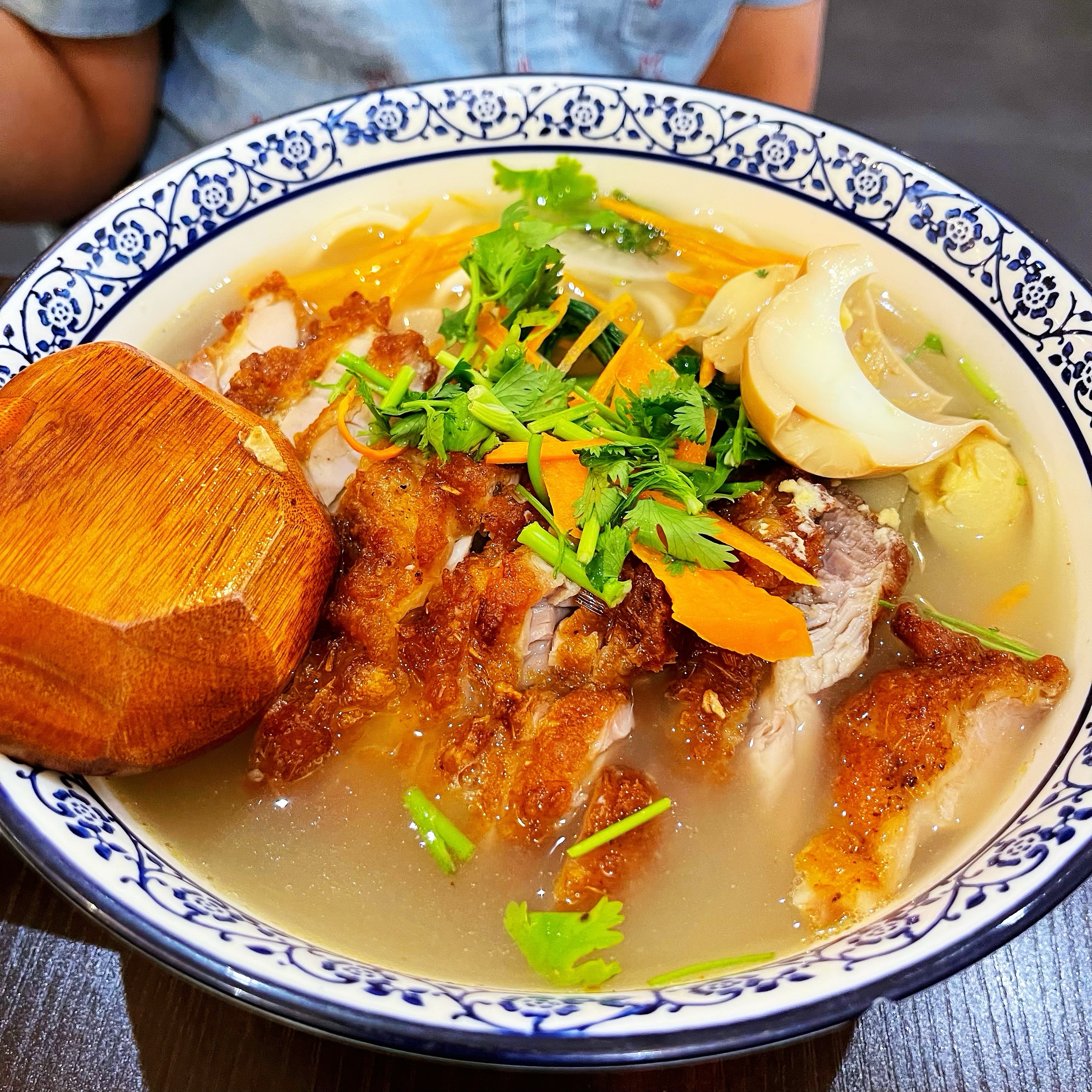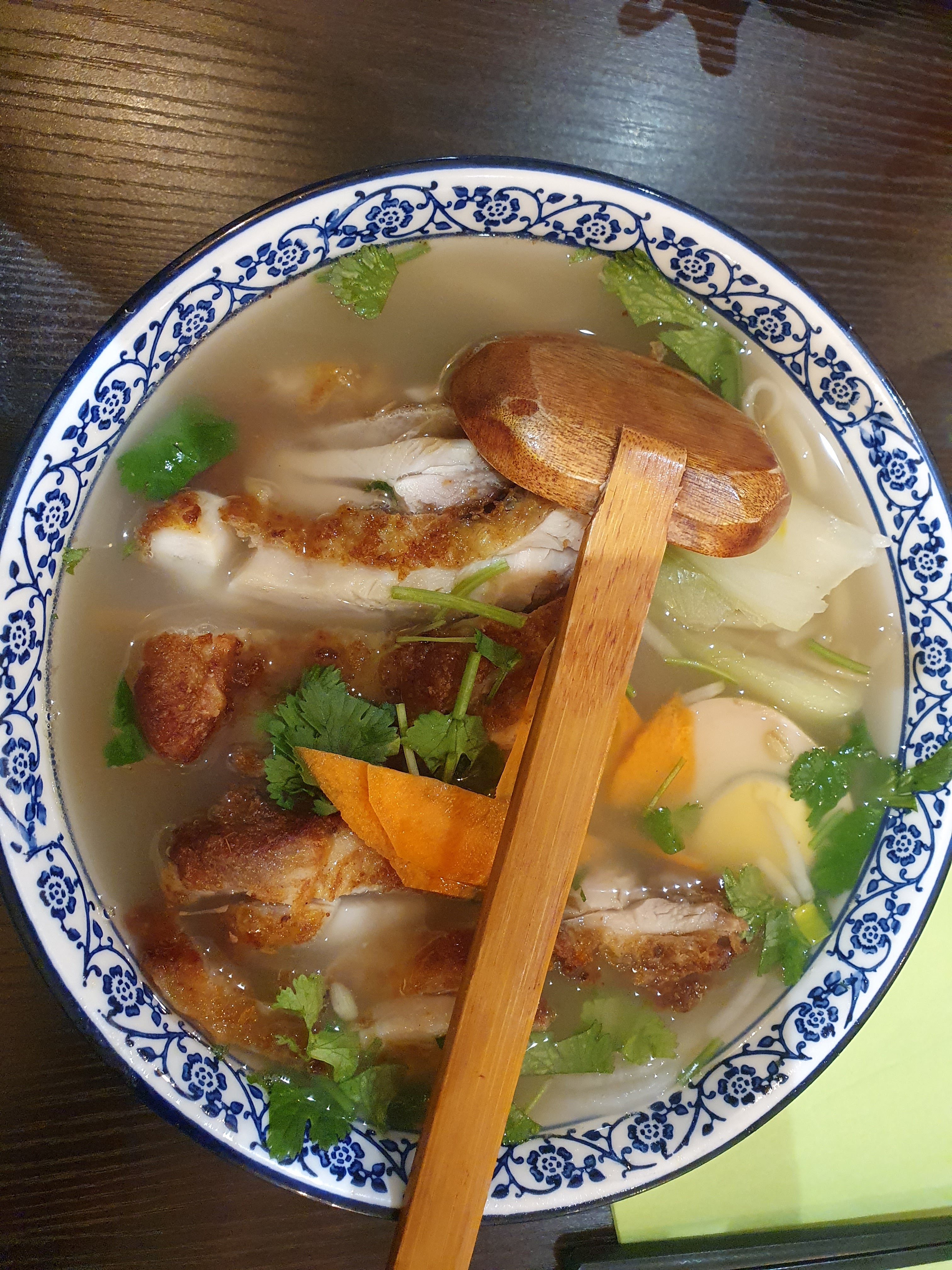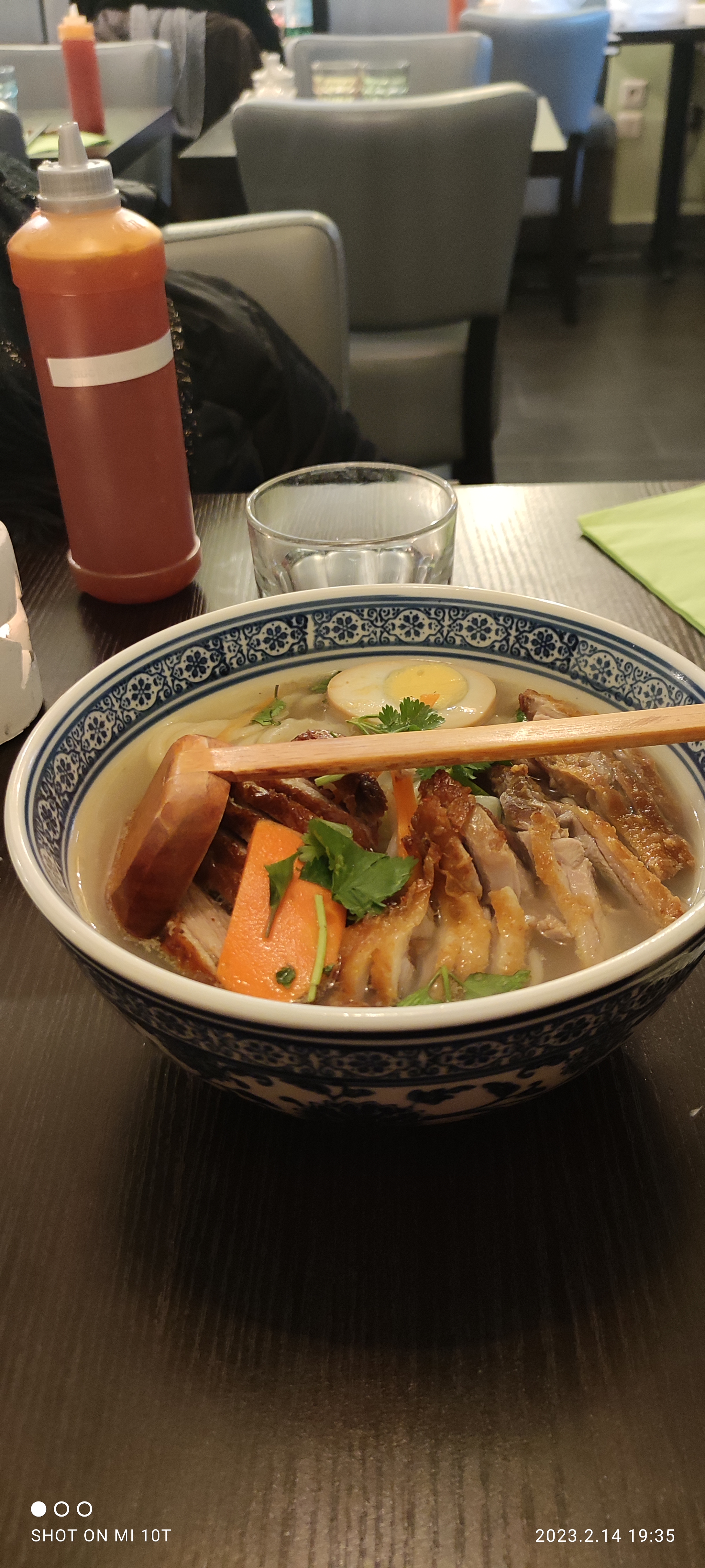 Soupe de nouilles au poulet croustillant délicieuse ! Il y a du monde le samedi mais il était un peu tard donc il y a avait une table. La salle est très simple mais jolie et propre, le personnel est très aimable, le service est rapide, vous voyez les cuisines où ils font danser les nouilles (car c'est fait maison), c'est sympa à voir. Les portions sont généreuses, la qualité est au rendez-vous pour 14€ c'est très correct. Avant 15h vous avez des formules midi avantageuses.