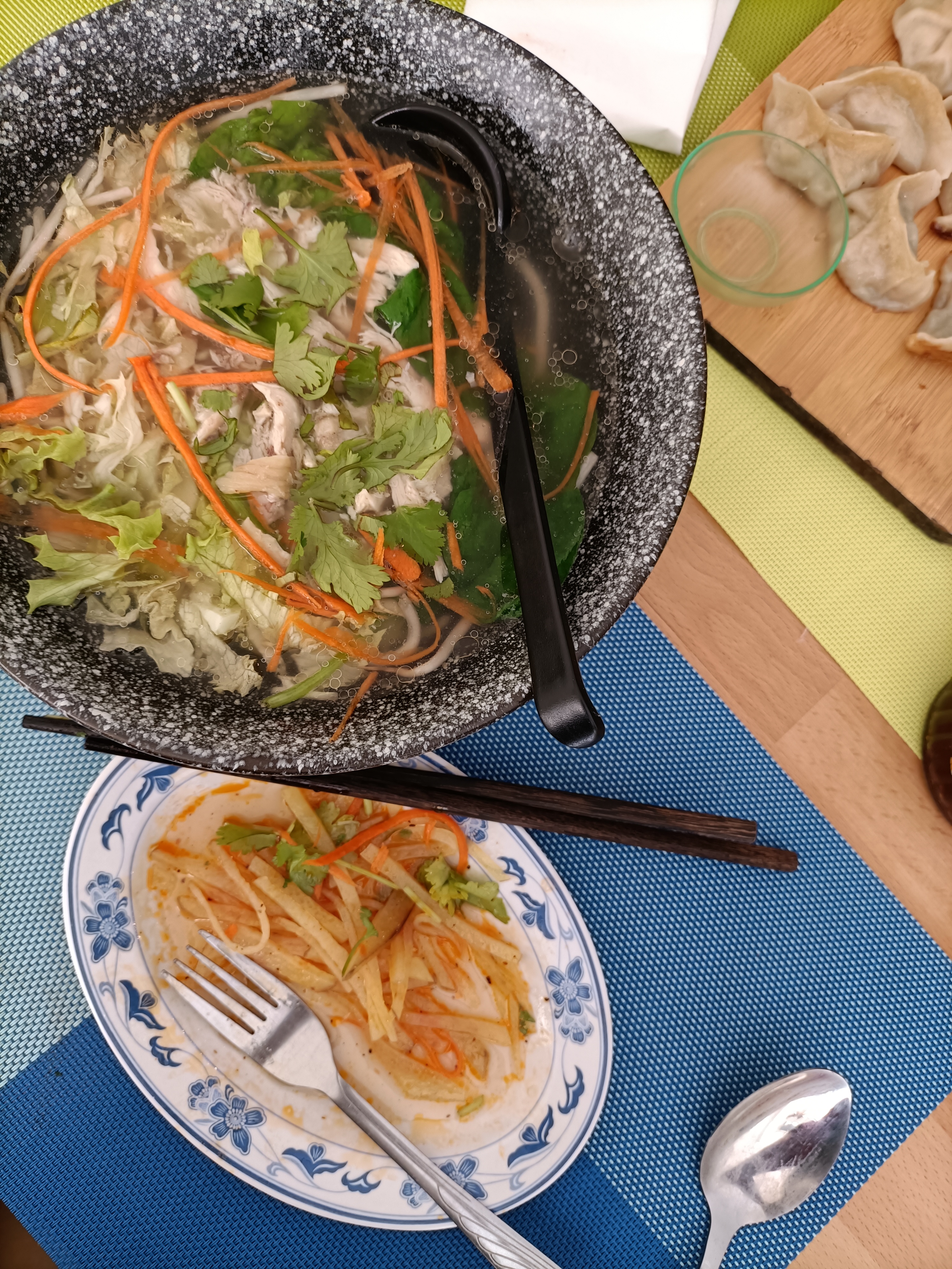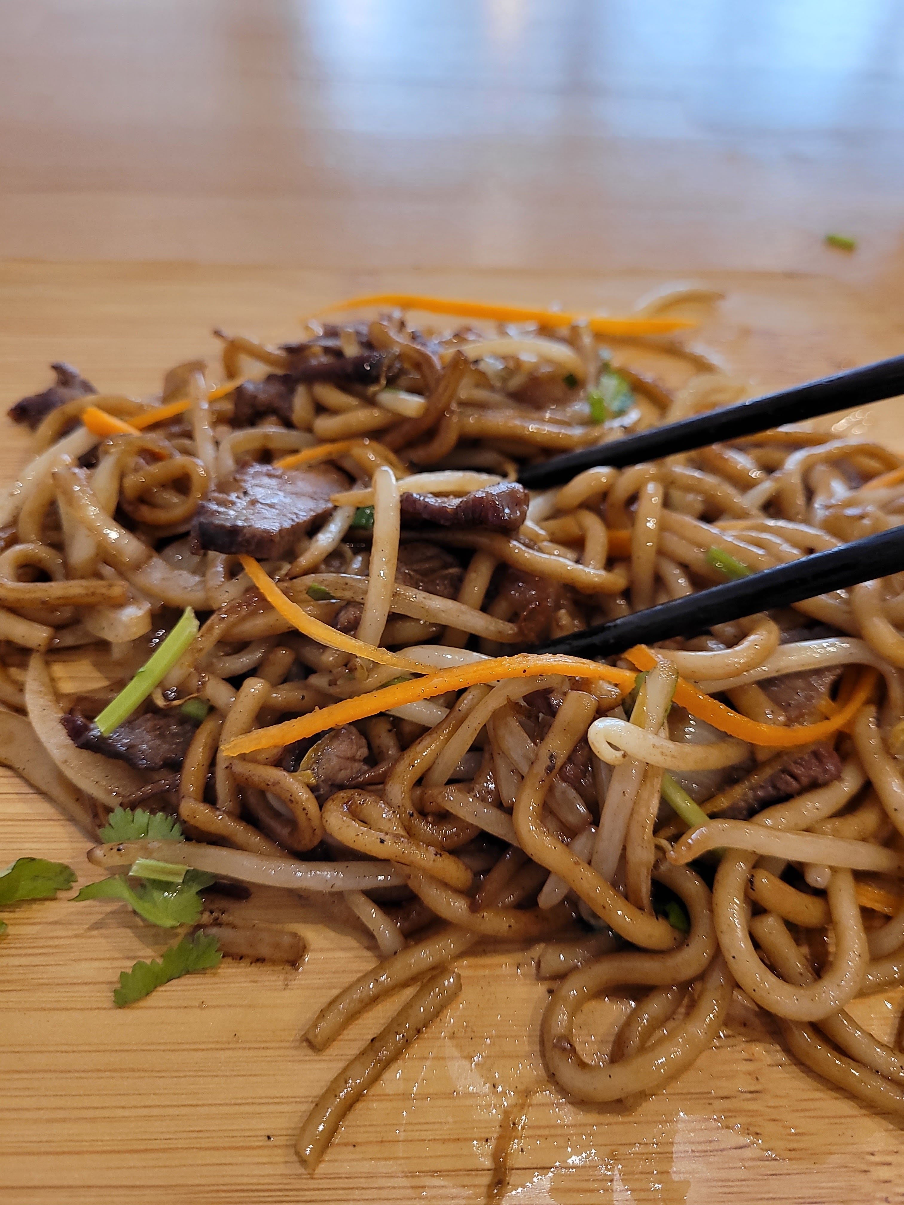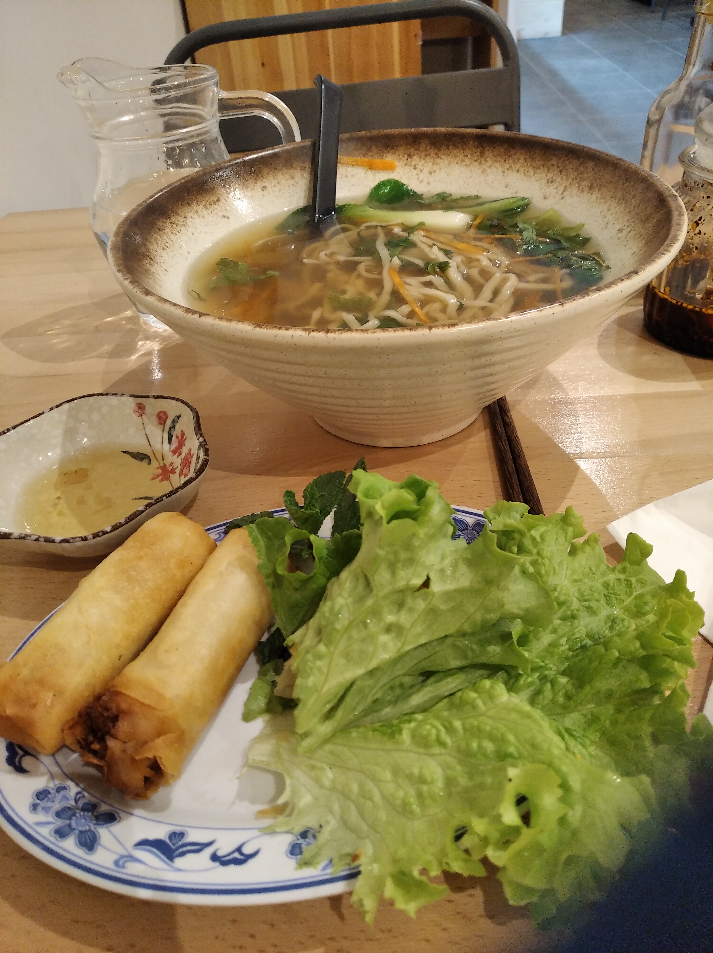 Sympathique découverte, déco épurée mais la chaleur du bois.bon accueil, disponible. Une petite soupe à l'oeuf et des nouilles aux saucisses chinoises (délicieux), pour monsieur petite salade de poulet et nouilles au boeuf, petite demi mangue pour finir.Une formule alléchante qui sera testée à notre prochaine visite : les brochettes à volonté. Merci !