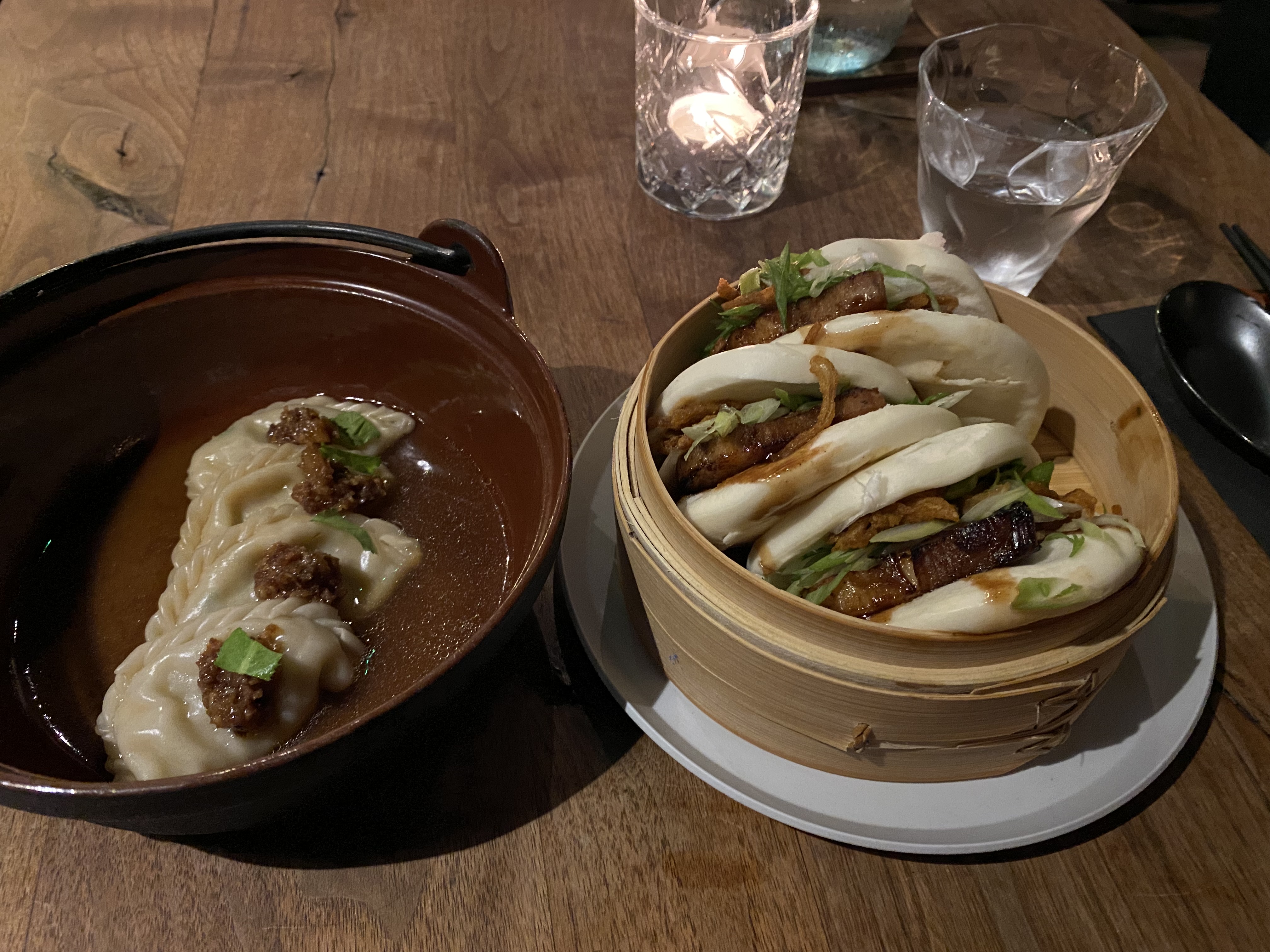 Nous avons eu le petit pain bao à la poitrine de porc et les boulettes de shiitake comme entrées, et nous avons tous deux eu les nouilles Udon au curry de noix de coco comme plat principal. Je dois dire que le pain bao et les raviolis étaient bons mais les nouilles Udon étaient médiocres. Et mieux vaut commander des entrées car vous auriez encore faim si vous n'aviez que des nouilles car la portion est pitoyable (à peine la moitié dans un bol). Le menu indique en fait des prix supplémentaires si vous voulez des nouilles, des œufs, etc. supplémentaires. (Remarque à l'intention de la direction : ne nickelez pas vos clients - offrez simplement suffisamment de nourriture.) Je vous suggère d'aller chez Eddy's pour des plats aux saveurs asiatiques. pour une meilleure valeur de votre argent.